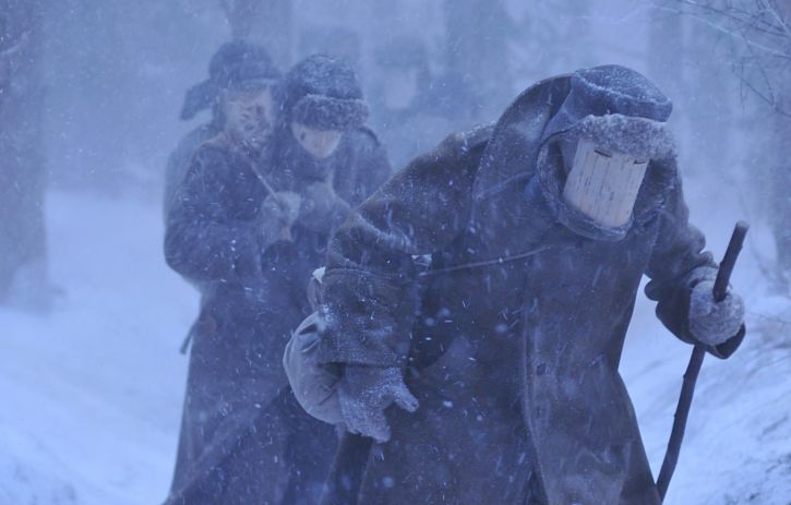 Janusz, played by Jim Sturgess, leads the way through the fierce snow storm. The blizzard is so strong they have to cover their faces in order to see where they're going.