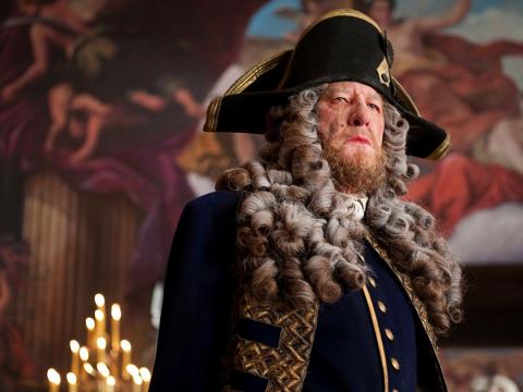 Captain Barbossa (Geoffrey Rush), the reformed pirate, dressed admirably as a respectable Royal Navy Officer.