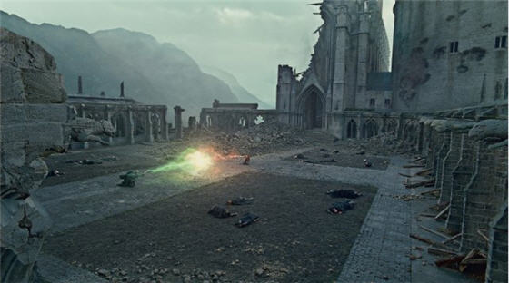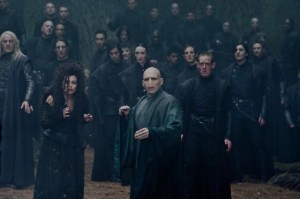 Voldemort, Belatrix (Helena Bonham Carter – Suffragette) and Lucius Malfoy (Jason Isaacs) leading the Death Eaters to the perimeter of Hogwarts, ready to lay siege to the school.