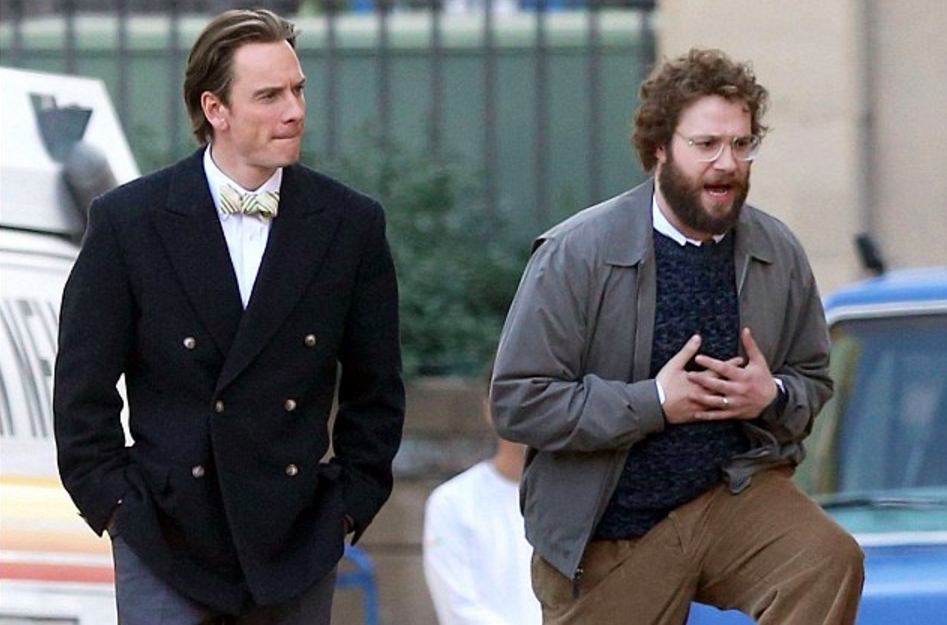Young Steve Jobs (Michael Fassbender, left) talking through his business plans with his friend and co-founder, Steve ‘Waz’ Wazniak (Seth Rogen, right, playing decently and in a non-comedic role for a change).