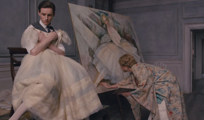 Einar holding a dress as his wife, Gerda (Alicia Vikander), draws him as a woman. Holding the dress, however, awakens Lili.