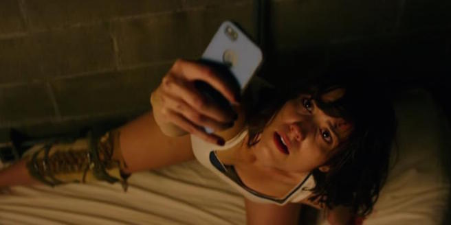 Michelle (Mary Elizabeth Winstead) looking for reception upon waking up to find herself locked in a bunker with her leg in a brace.
