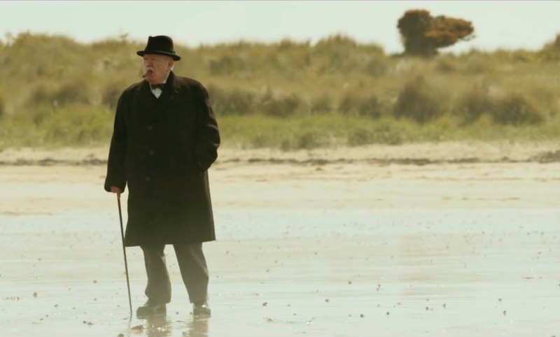 Winston Churchill (Brian Cox), smoking a Churchill cigar, contemplating events of two decades past as he walks along the beach.