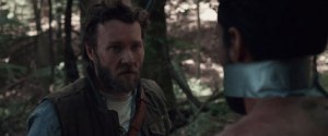 Paul (Joel Edgerton) questioning Will (Christopher Abbott), who he has tied up to a tree and gagged, after Will broke into his house.